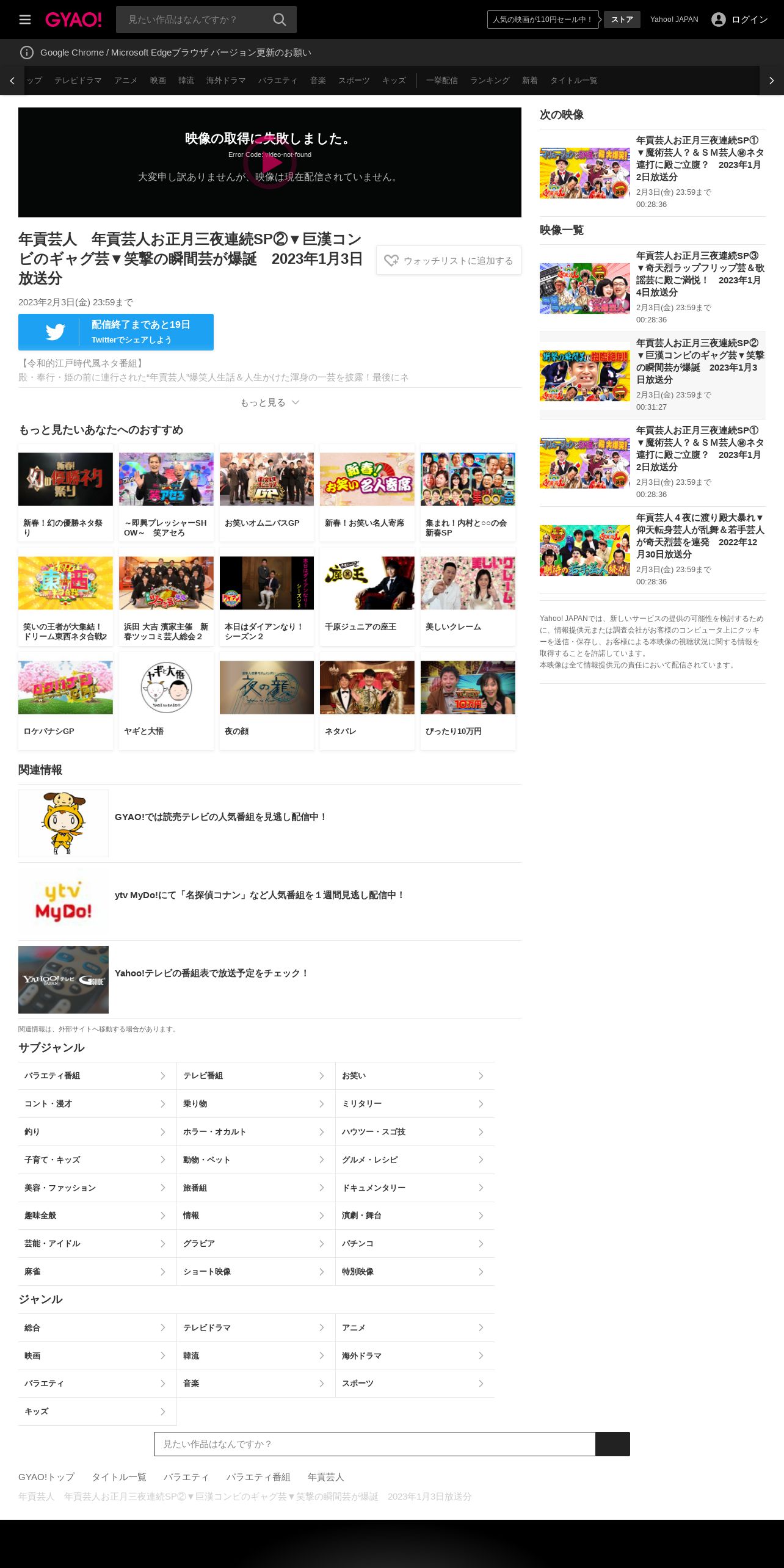 取得元URL: https://gyao.yahoo.co.jp:443/episode/%E5%B9%B4%E8%B2%A2%E8%8A%B8%E4%BA%BA%E3%80%80%E5%B9%B4%E8%B2%A2%E8%8A%B8%E4%BA%BA%E3%81%8A%E6%AD%A3%E6%9C%88%E4%B8%89%E5%A4%9C%E9%80%A3%E7%B6%9ASP%E2%91%A1%E2%96%BC%E5%B7%A8%E6%BC%A2%E3%82%B3%E3%83%B3%E3%83%93%E3%81%AE%E3%82%AE%E3%83%A3%E3%82%B0%E8%8A%B8%E2%96%BC%E7%AC%91%E6%92%83%E3%81%AE%E7%9E%AC%E9%96%93%E8%8A%B8%E3%81%8C%E7%88%86%E8%AA%95%E3%80%802023%E5%B9%B41%E6%9C%883%E6%97%A5%E6%94%BE%E9%80%81%E5%88%86/63abfa55-5cf0-4a5a-8ff6-aa6b55457d04