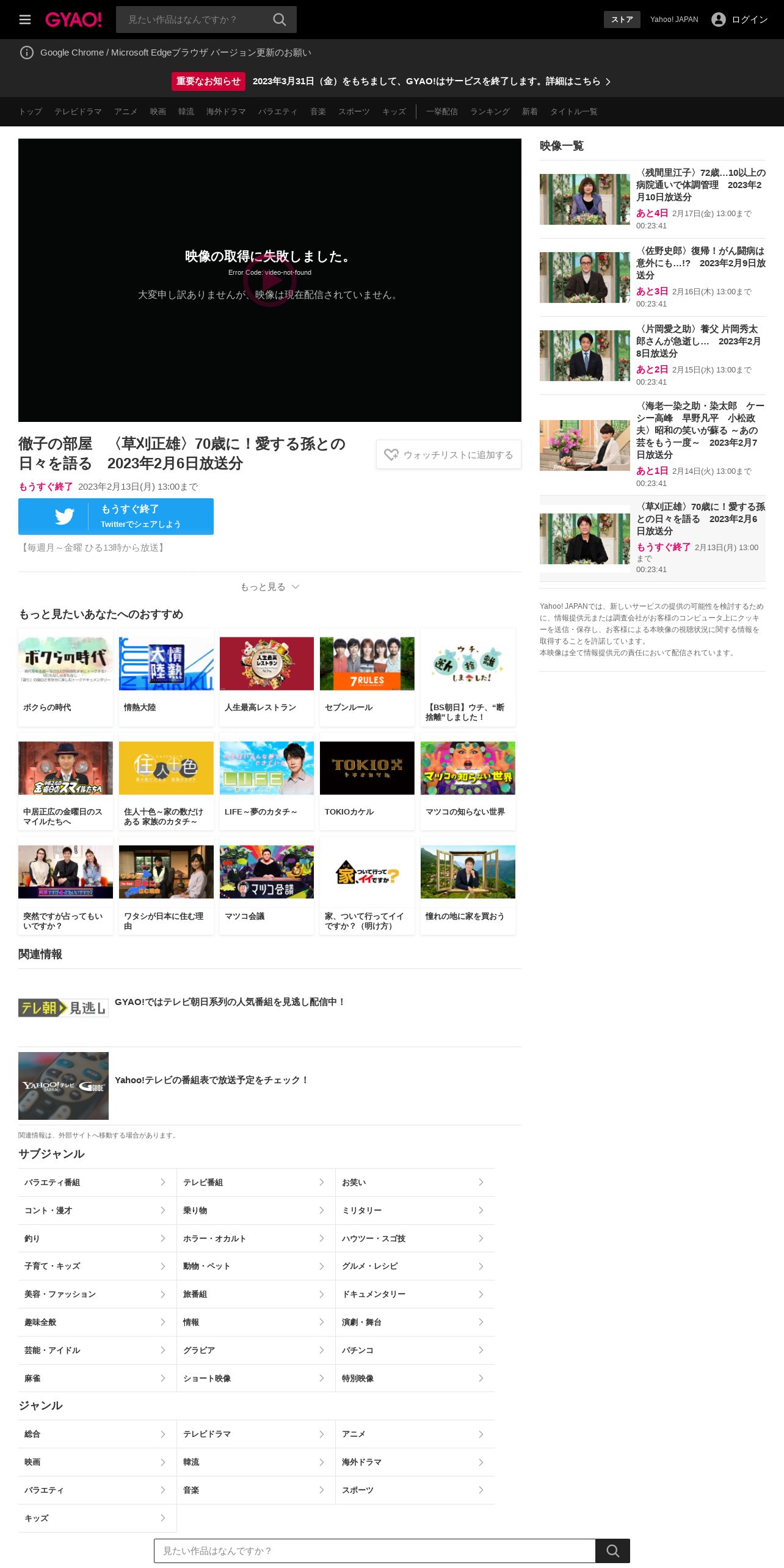 https://gyao.yahoo.co.jp:443/episode/%E5%BE%B9%E5%AD%90%E3%81%AE%E9%83%A8%E5%B1%8B%E3%80%80%E3%80%88%E8%8D%89%E5%88%88%E6%AD%A3%E9%9B%84%E3%80%8970%E6%AD%B3%E3%81%AB%EF%BC%81%E6%84%9B%E3%81%99%E3%82%8B%E5%AD%AB%E3%81%A8%E3%81%AE%E6%97%A5%E3%80%85%E3%82%92%E8%AA%9E%E3%82%8B%E3%80%802023%E5%B9%B42%E6%9C%886%E6%97%A5%E6%94%BE%E9%80%81%E5%88%86/63cf7bd6-cd1e-47c6-b30c-59b5ec800be6