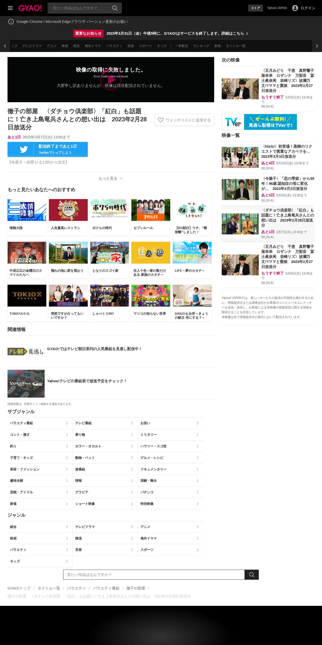 https://gyao.yahoo.co.jp:443/episode/%E5%BE%B9%E5%AD%90%E3%81%AE%E9%83%A8%E5%B1%8B%E3%80%80%E3%80%88%E3%83%80%E3%83%81%E3%83%A7%E3%82%A6%E5%80%B6%E6%A5%BD%E9%83%A8%E3%80%89%E3%80%8C%E7%B4%85%E7%99%BD%E3%80%8D%E3%82%82%E8%A9%B1%E9%A1%8C%E3%81%AB%EF%BC%81%E4%BA%A1%E3%81%8D%E4%B8%8A%E5%B3%B6%E7%AB%9C%E5%85%B5%E3%81%95%E3%82%93%E3%81%A8%E3%81%AE%E6%83%B3%E3%81%84%E5%87%BA%E3%81%AF%E3%80%802023%E5%B9%B42%E6%9C%8828%E6%97%A5%E6%94%BE%E9%80%81%E5%88%86/63f5c1a2-3a23-4ef0-aac8-903e1d461b2d