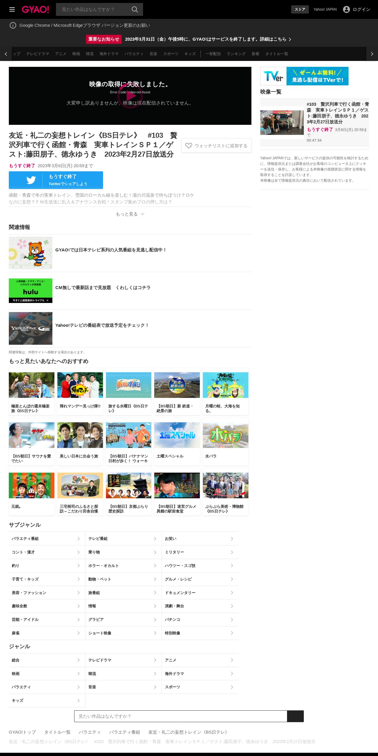 https://gyao.yahoo.co.jp:443/episode/%E5%8F%8B%E8%BF%91%E3%83%BB%E7%A4%BC%E4%BA%8C%E3%81%AE%E5%A6%84%E6%83%B3%E3%83%88%E3%83%AC%E3%82%A4%E3%83%B3%E3%80%8ABS%E6%97%A5%E3%83%86%E3%83%AC%E3%80%8B%E3%80%80%23103%E3%80%80%E8%B4%85%E6%B2%A2%E5%88%97%E8%BB%8A%E3%81%A7%E8%A1%8C%E3%81%8F%E5%87%BD%E9%A4%A8%E3%83%BB%E9%9D%92%E6%A3%AE%E3%80%80%E5%AE%9F%E8%BB%8A%E3%83%88%E3%83%AC%E3%82%A4%E3%83%B3%EF%BC%B3%EF%BC%B0%EF%BC%91%EF%BC%8F%E3%82%B2%E3%82%B9%E3%83%88%3A%E8%97%A4%E7%94%B0%E6%9C%8B%E5%AD%90%E3%80%81%E5%BE%B3%E6%B0%B8%E3%82%86%E3%81%86%E3%81%8D%E3%80%802023%E5%B9%B42%E6%9C%8827%E6%97%A5%E6%94%BE%E9%80%81%E5%88%86/63fc10cc-7a74-4327-a9c8-e702237cb5a7