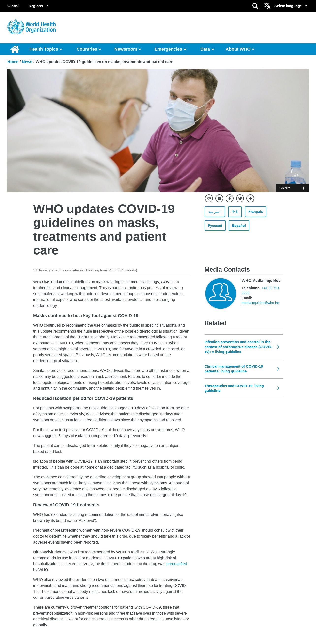 https://www.who.int:443/news/item/13-01-2023-who-updates-covid-19-guidelines-on-masks--treatments-and-patient-care