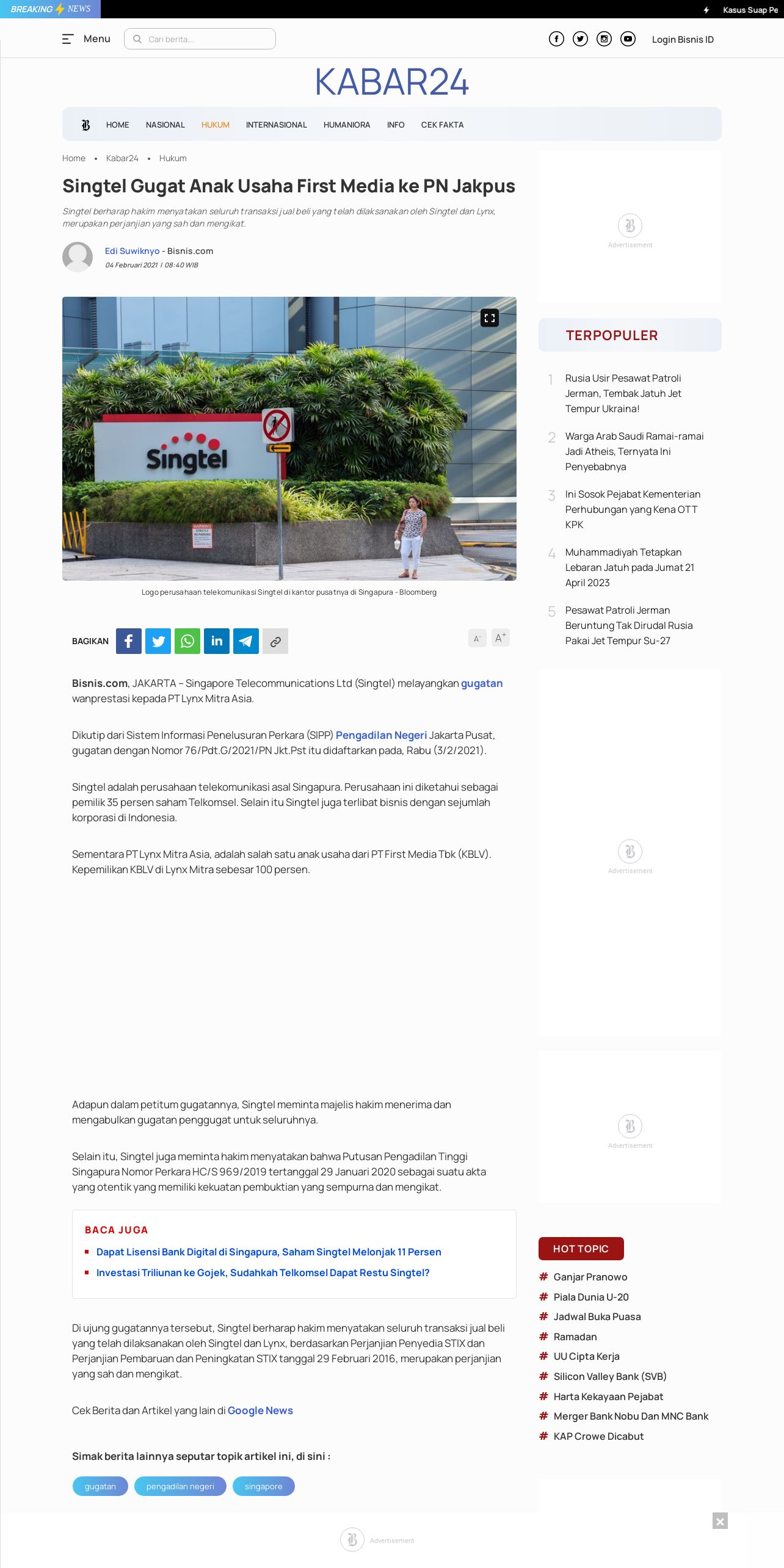 https://kabar24.bisnis.com:443/read/20210204/16/1352098/singtel-gugat-anak-usaha-first-media-ke-pn-jakpus