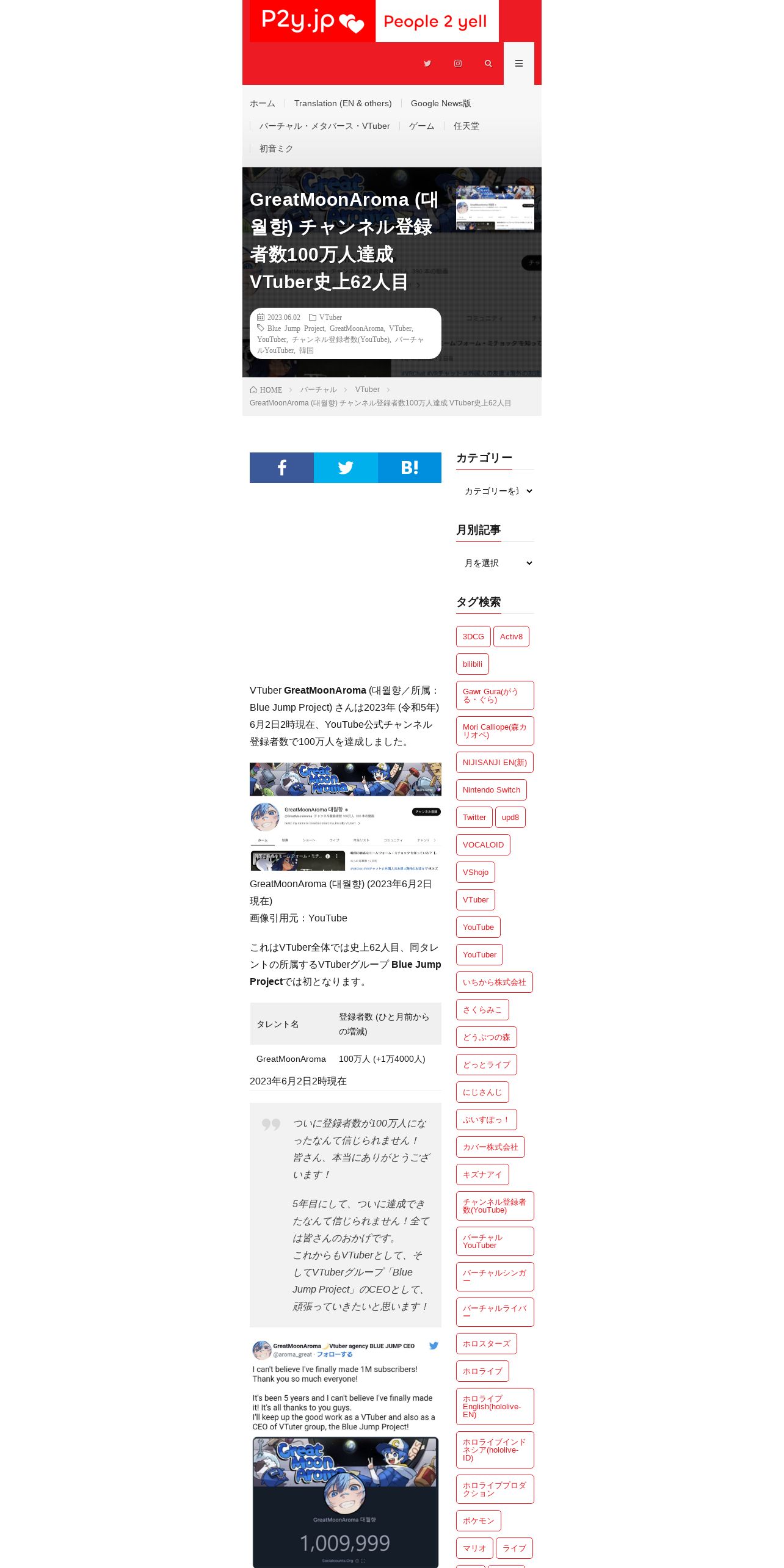 https://p2y.jp:443/greatmoonaroma-1-million-youtube-subscribers-62th-vtuber-in-history/