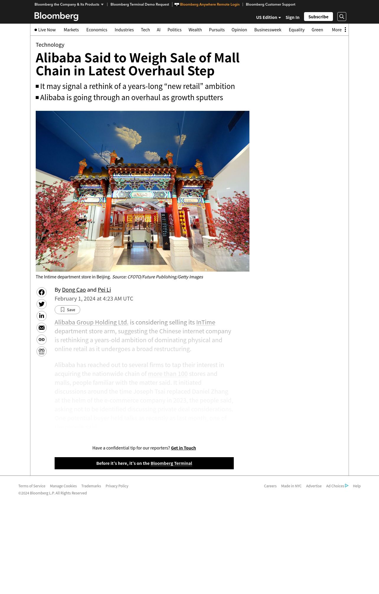 https://www.bloomberg.com:443/news/articles/2024-02-01/alibaba-said-to-weigh-sale-of-mall-chain-in-latest-overhaul-step