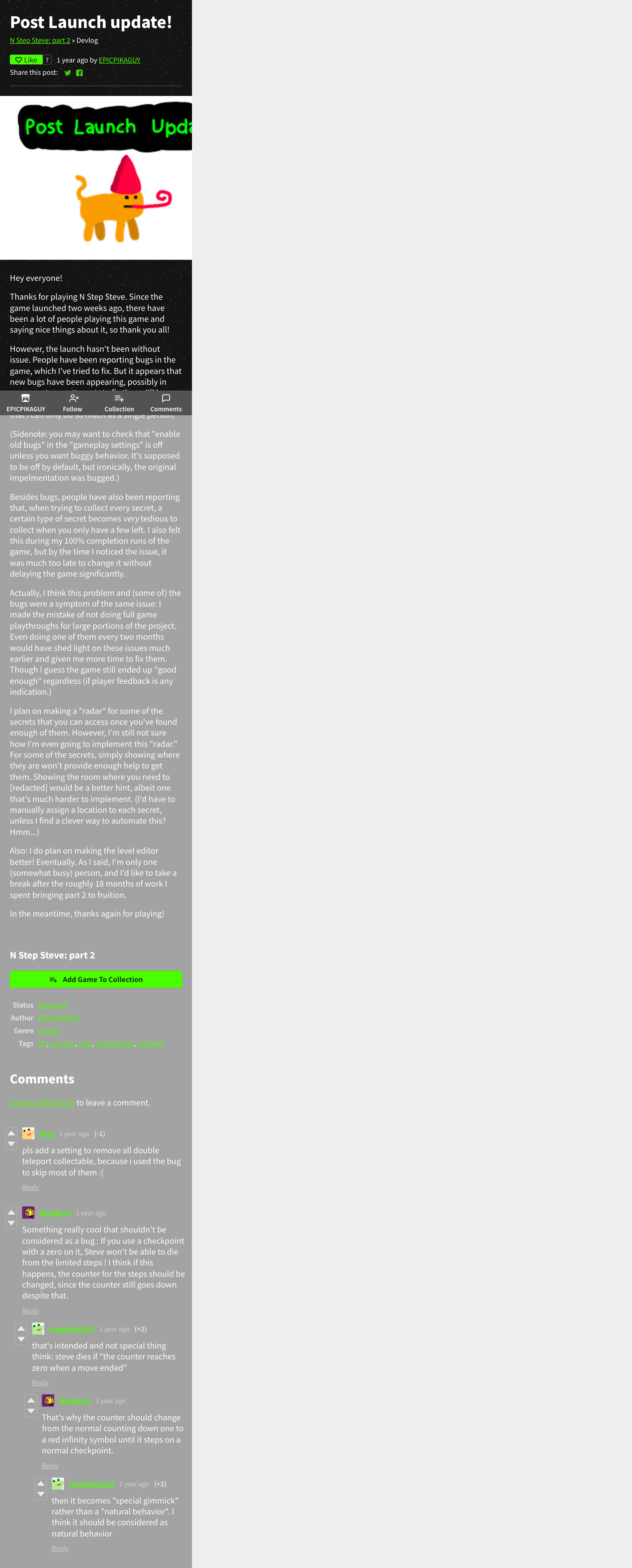 https://epicpikaguy.itch.io:443/n-step-steve-part-2/devlog/471982/post-launch-update