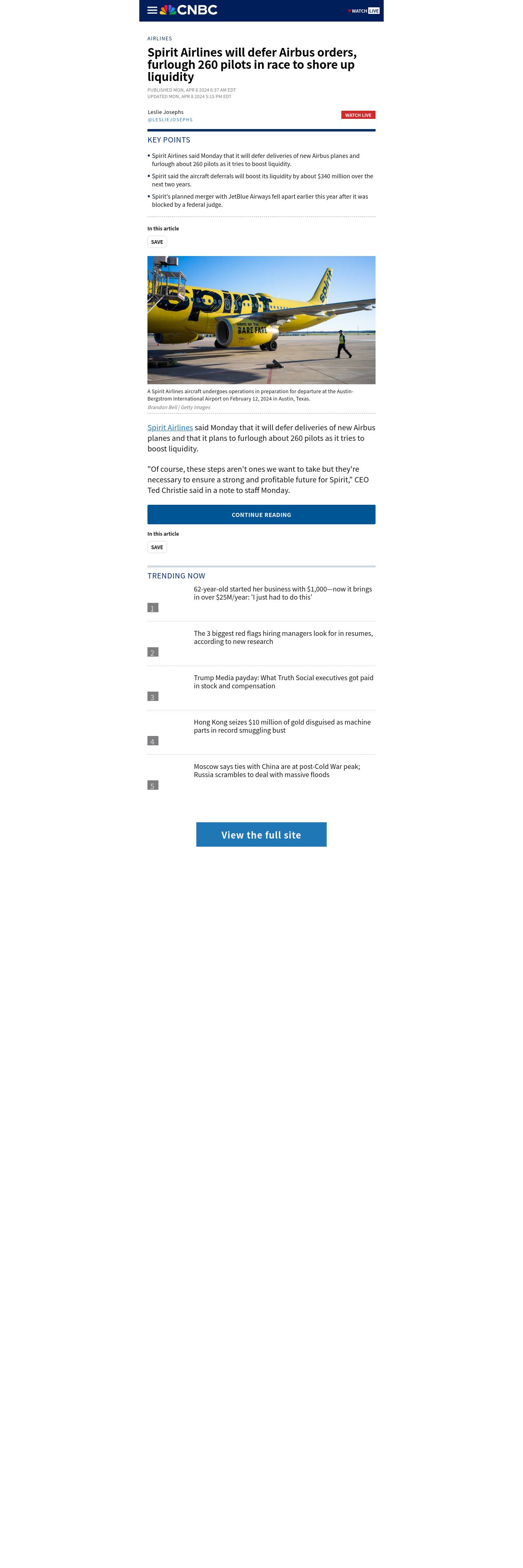 https://www.cnbc.com:443/amp/2024/04/08/spirit-airlines-will-defer-airbus-orders-furlough-260-pilots.html