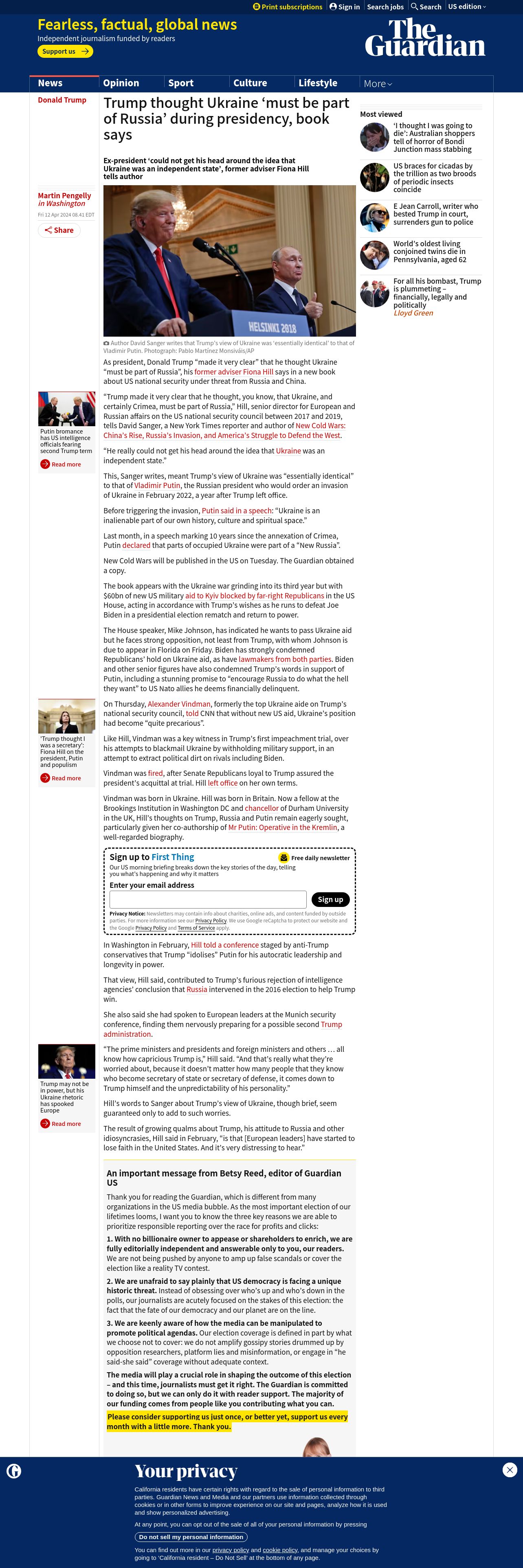 https://www.theguardian.com:443/us-news/2024/apr/12/trump-russia-ukraine-book-comments