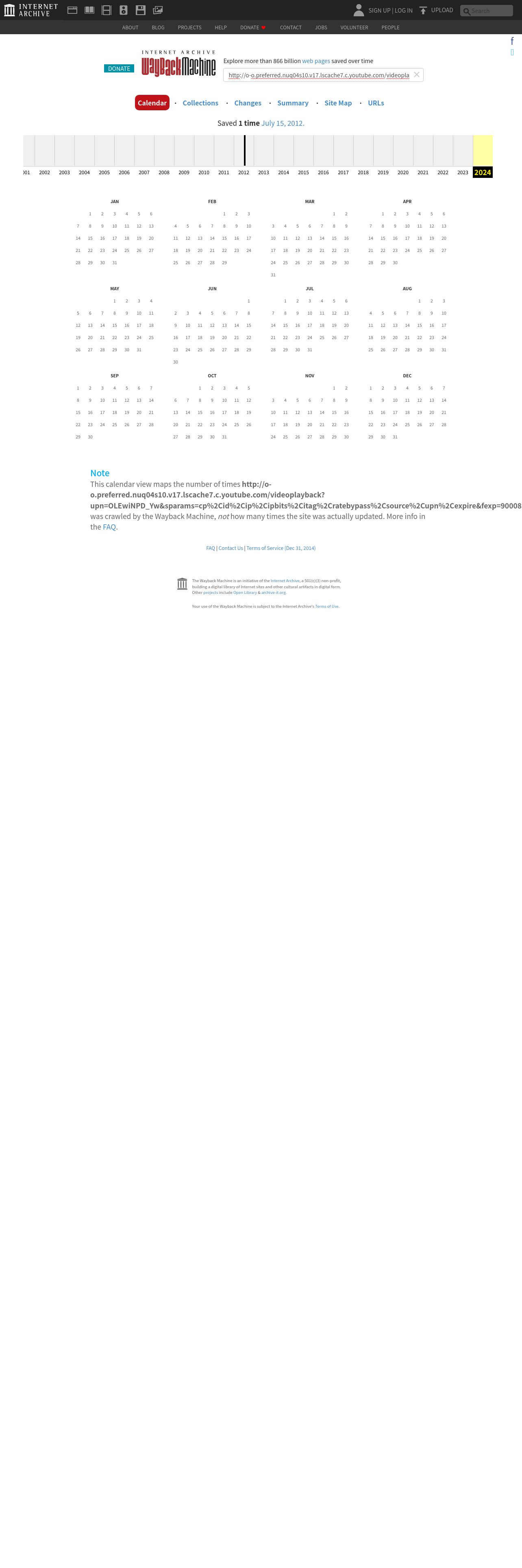 http://web.archive.org/web/20240000000000*/http://o-o.preferred.nuq04s10.v17.lscache7.c.youtube.com/videoplayback?upn=OLEwiNPD_Yw&sparams=cp%2Cid%2Cip%2Cipbits%2Citag%2Cratebypass%2Csource%2Cupn%2Cexpire&fexp=900081%2C907217%2C907335%2C921602%2C919306%2C922600%2C919316%2C919804%2C920704%2C924500%2C906831%2C924700%2C913542%2C919324%2C920706%2C924402%2C907344%2C912706%2C902518&ms=au&itag=37&ipbits=8&signature=A7569794F886F02398B50ABBEC09E21F6A0D783A.09873FB091095342CC4E5B46465B0156D40FAAB3&sver=3&mt=1342338675&ratebypass=yes&source=youtube&expire=1342361961&key=yt1&ip=207.241.237.185&cp=U0hTR1NRT19LS0NOM19LS1NKOndiN1Q0OVRnQWdK&id=f5b664a7bab5f5fd