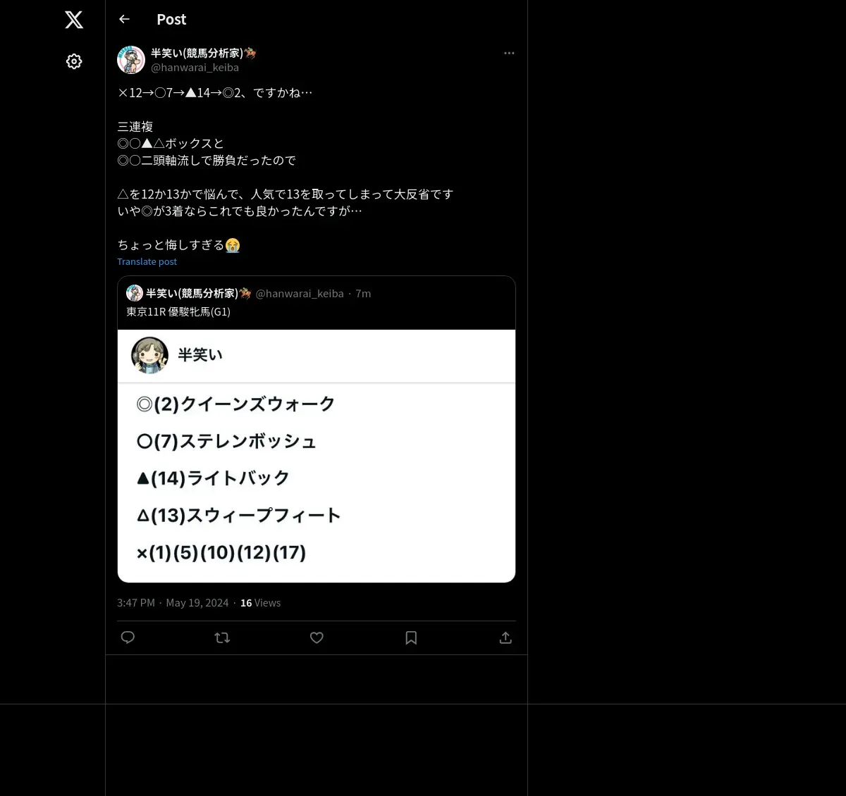 https://x.com:443/hanwarai_keiba/status/1792084743749824754