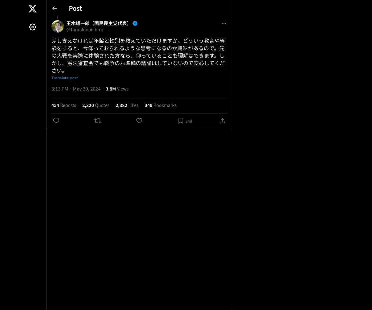 https://x.com:443/tamakiyuichiro/status/1796062281291174027?t=v78RK5YaLrr3TkFe8el9Bw&s=19