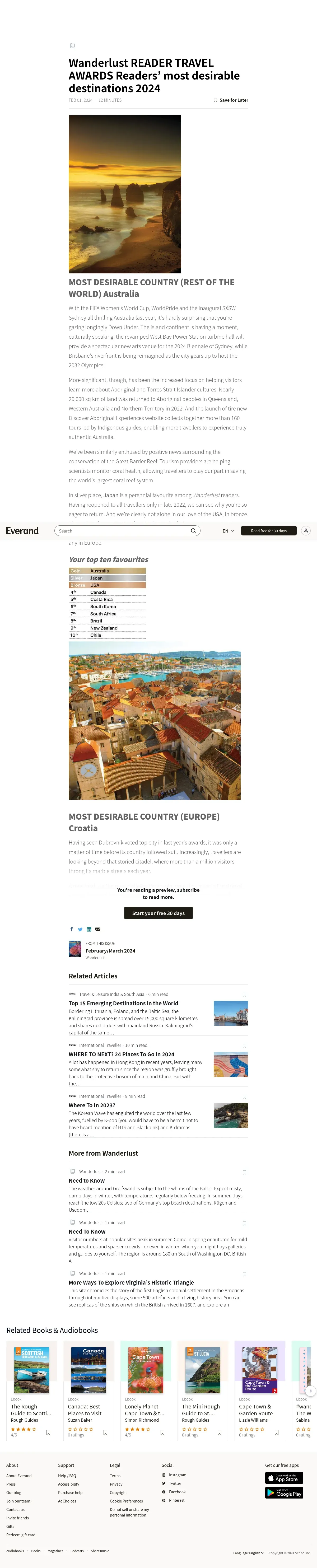 https://www.everand.com:443/article/703411358/Wanderlust-Reader-Travel-Awards-Readers-Most-Desirable-Destinations-2024