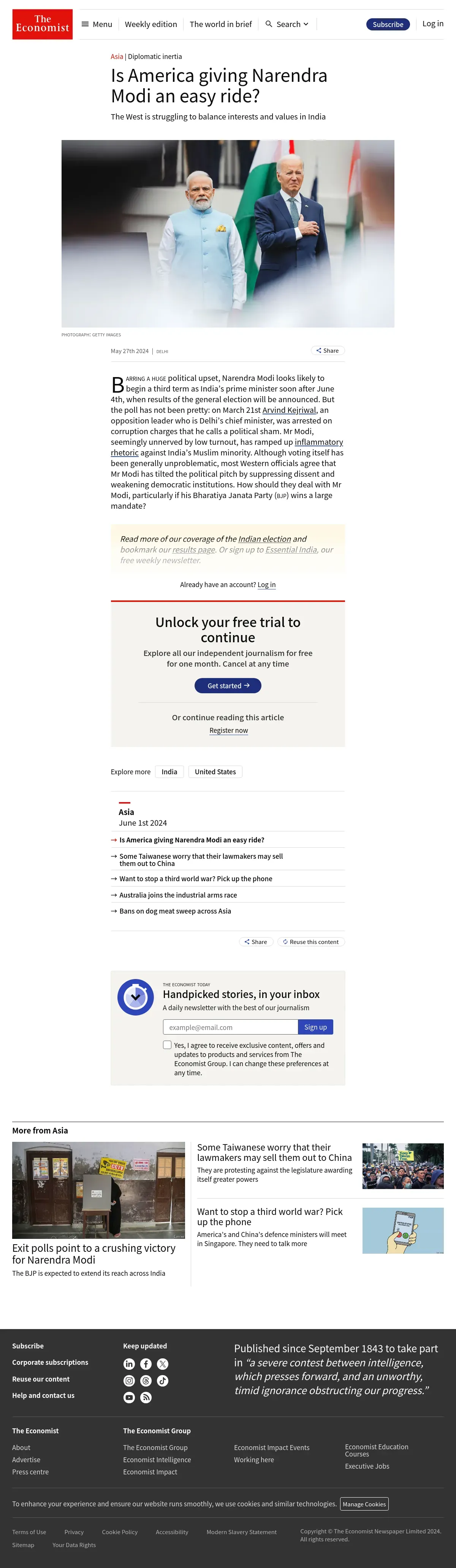 取得元URL: https://www.economist.com:443/asia/2024/05/27/is-america-giving-narendra-modi-an-easy-ride