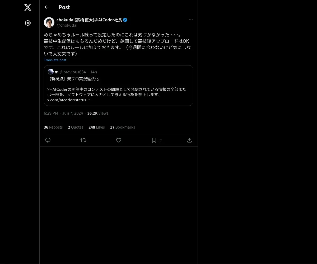 https://x.com:443/chokudai/status/1799010718555242617