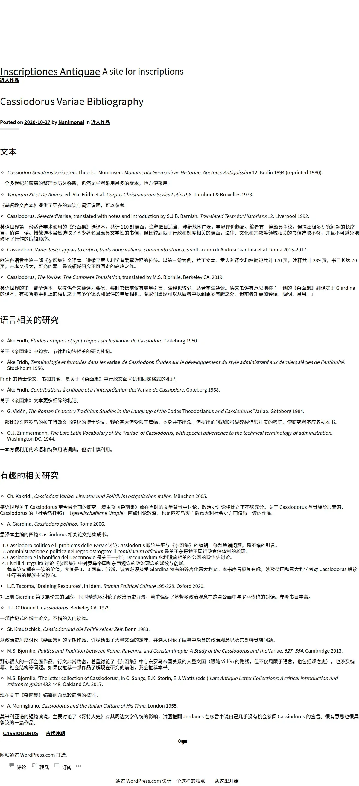取得元URL: https://inscriptionesantiquae.wordpress.com:443/2020/10/27/cassiodorus-bibliography/