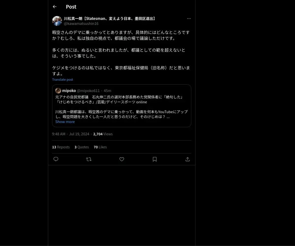 取得元URL: https://x.com:443/kawamatsushin16/status/1814099943113752717