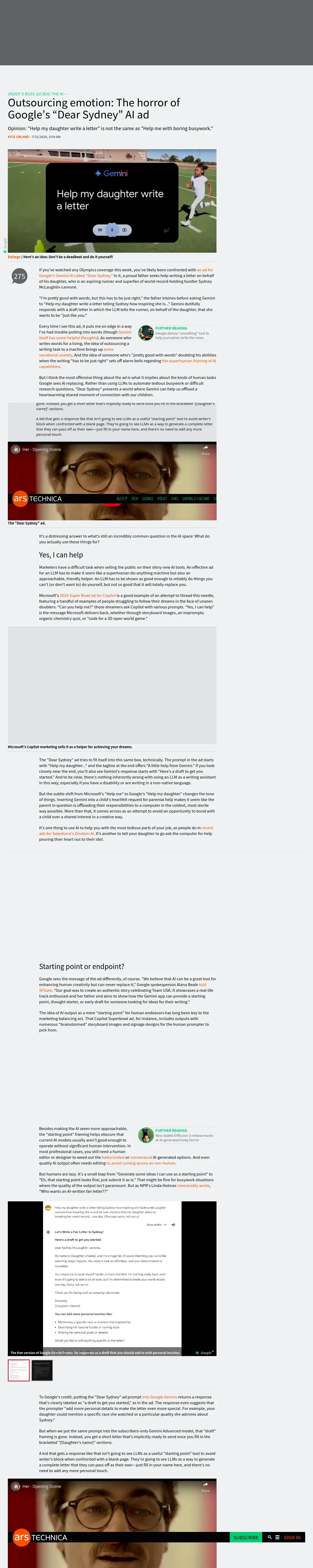 https://arstechnica.com:443/ai/2024/07/dear-sydney-why-i-find-googles-ai-olympics-ad-so-disturbing/