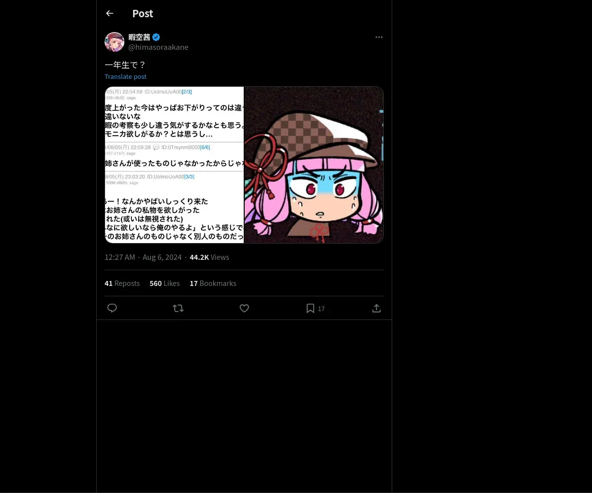 取得元URL: https://x.com:443/himasoraakane/status/1820481872000135523
