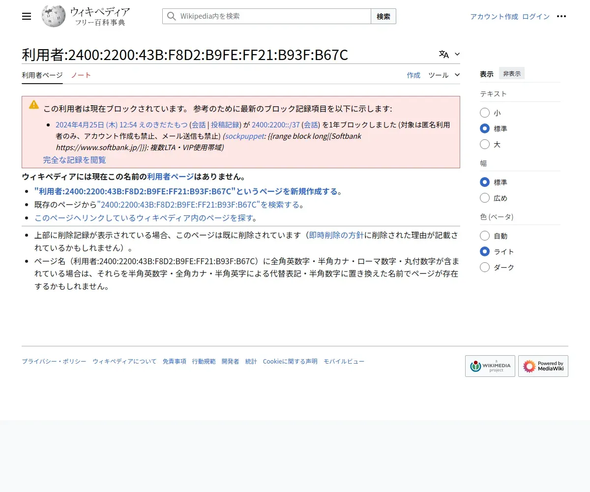 https://ja.wikipedia.org:443/wiki/User:2400:2200:43b:f8d2:b9fe:ff21:b93f:b67c