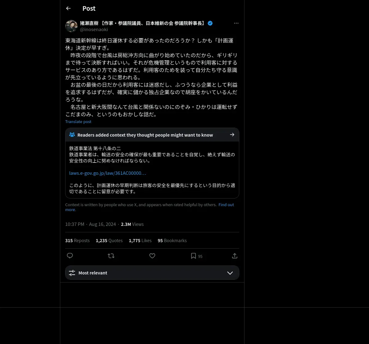 https://x.com:443/inosenaoki/status/1824440400645591462
