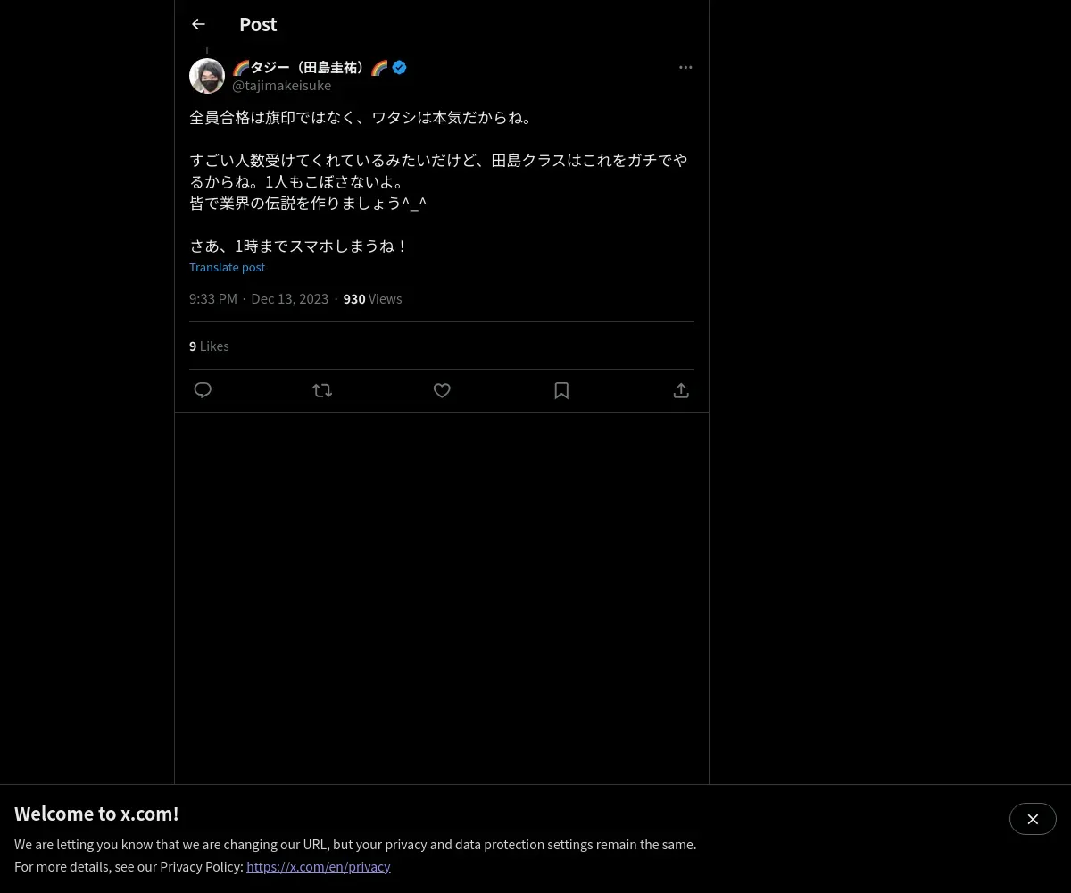 取得元URL: https://x.com:443/tajimakeisuke/status/1734914525542195363
