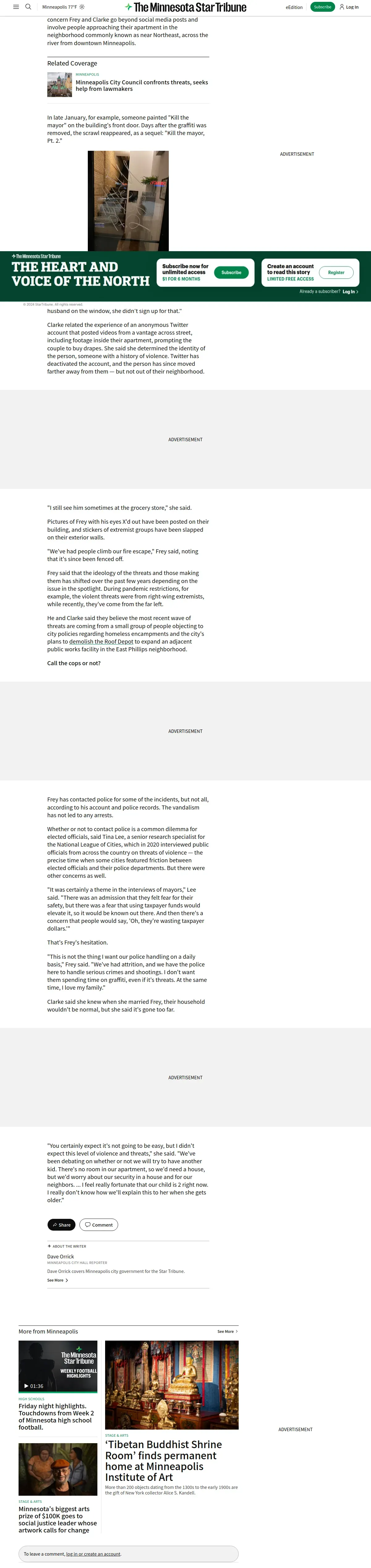 https://www.startribune.com:443/jacob-frey-and-wife-sarah-clarke-death-threats-minneapolis-mayor/600258091