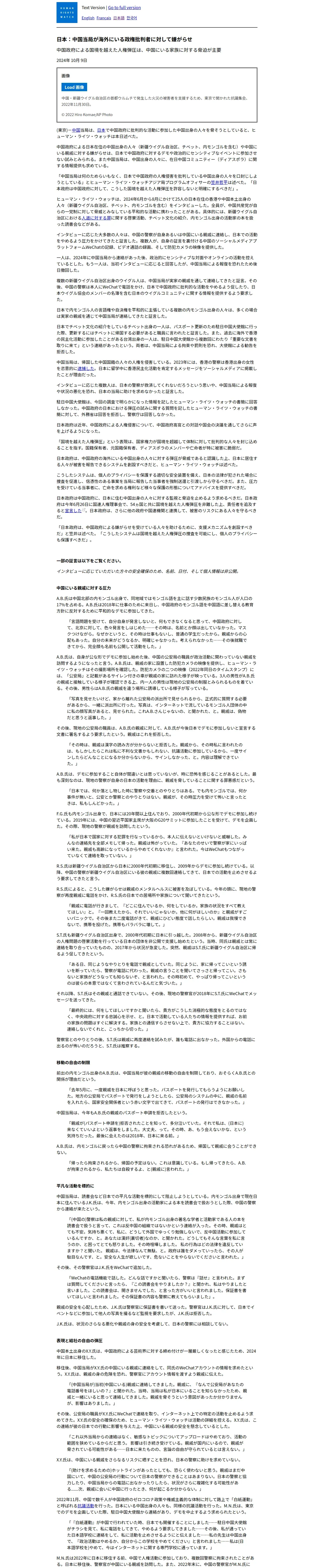 取得元URL: https://text.hrw.org:443/ja/news/2024/10/09/japan-chinese-authorities-harass-critics-abroad