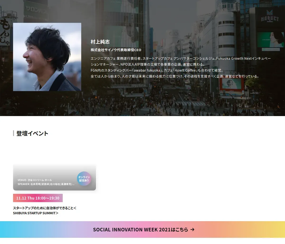 https://social-innovation-week-shibuya.jp:443/2020/speakerlist/%E6%9D%91%E4%B8%8A%E7%B4%94%E5%BF%97/