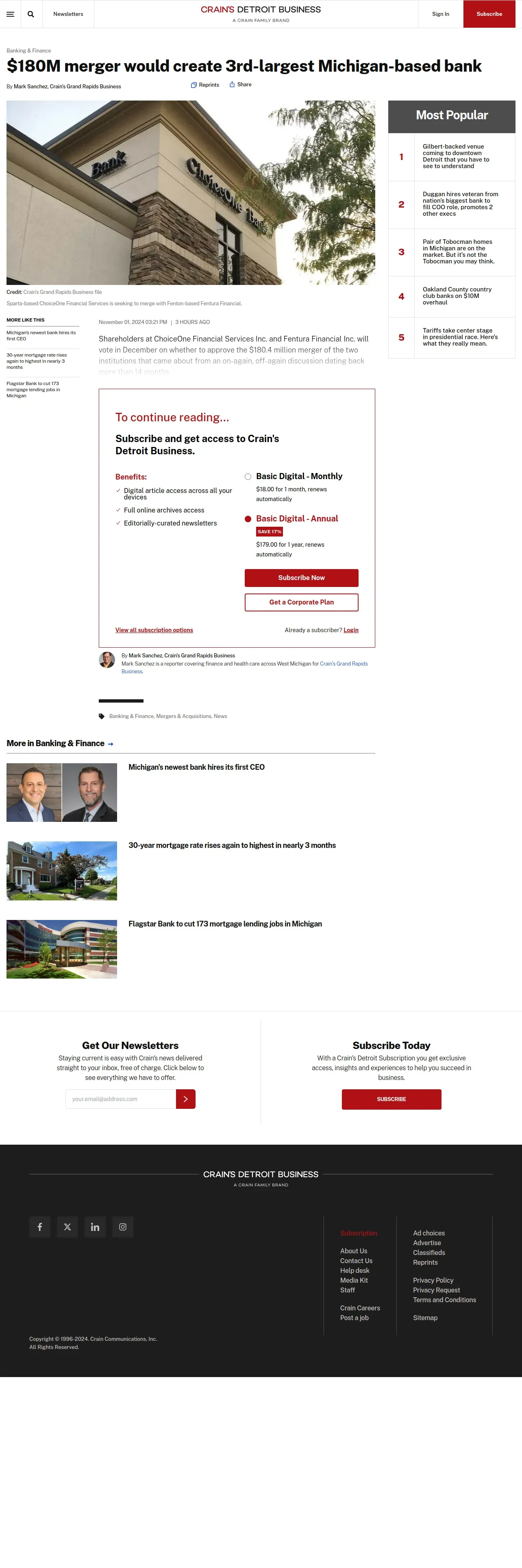 取得元URL: https://www.crainsdetroit.com:443/banking-finance/choiceone-seeks-1804m-merger-fentura-financial