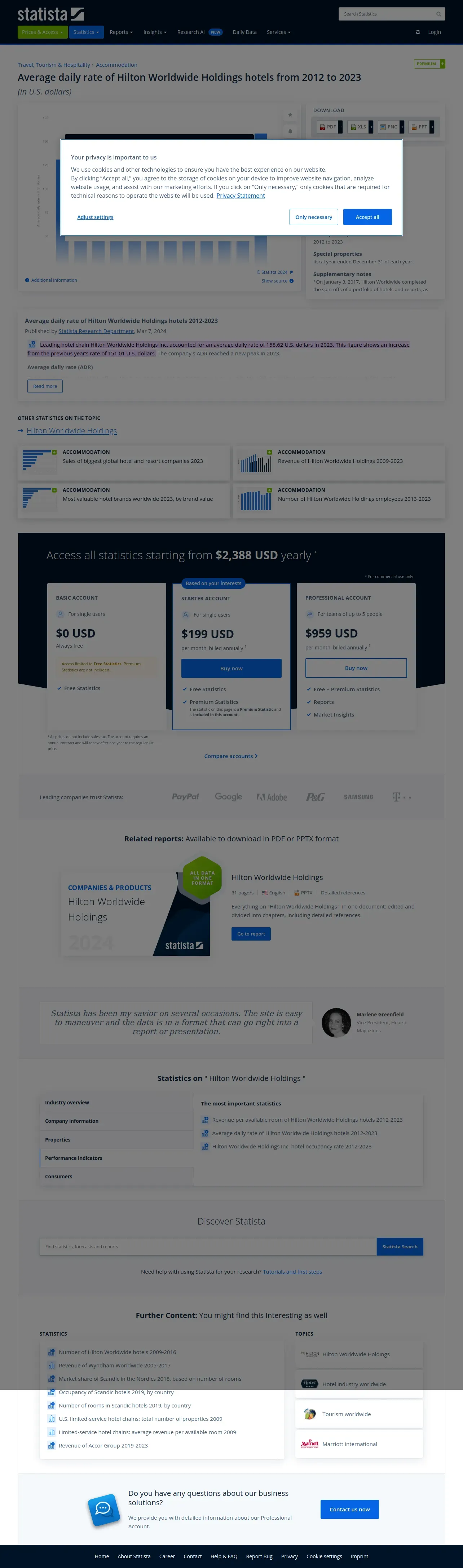 取得元URL: https://www.statista.com:443/statistics/297768/average-daily-rate-in-hilton-worldwide-holdings-inc-hotels/#:~:text=Average%20daily%20rate%20of%20Hilton%20Worldwide%20Holdings%20hotels%202012-2023&text=Leading%20hotel%20chain%20Hilton%20Worldwide,rate%20of%20151.01%20U.S.%20dollars.
