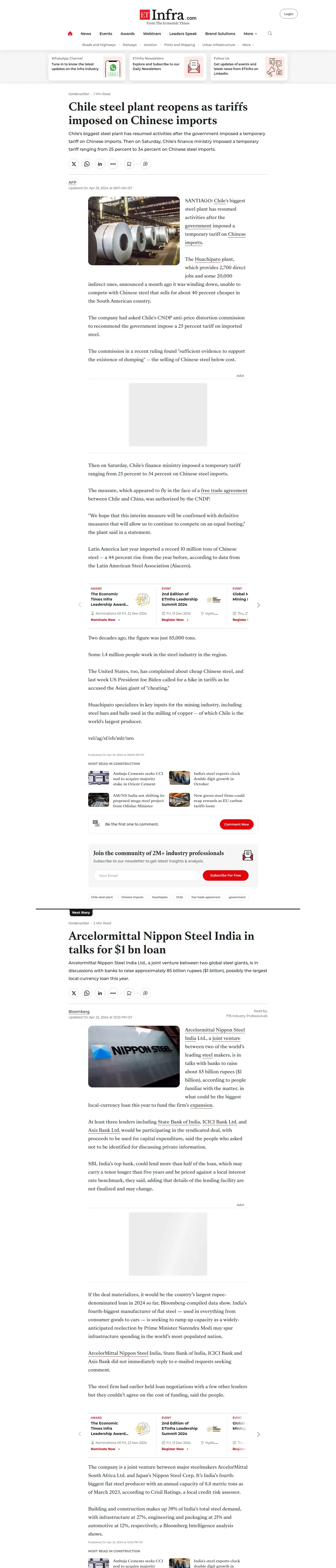 https://infra.economictimes.indiatimes.com:443/news/construction/chile-steel-plant-reopens-as-tariffs-imposed-on-chinese-imports/109516388