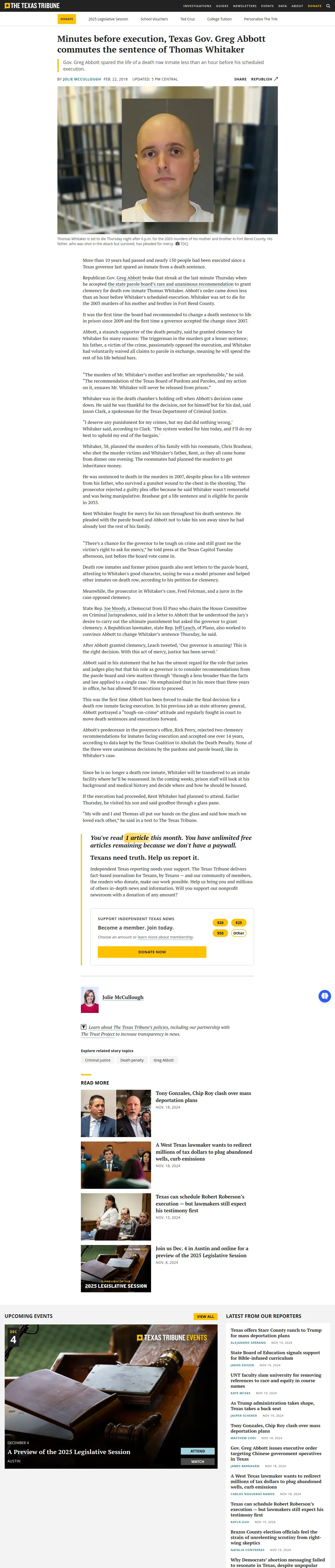 https://www.texastribune.org:443/2018/02/22/texas-gov-greg-abbott-thomas-whitaker-death-sentence/