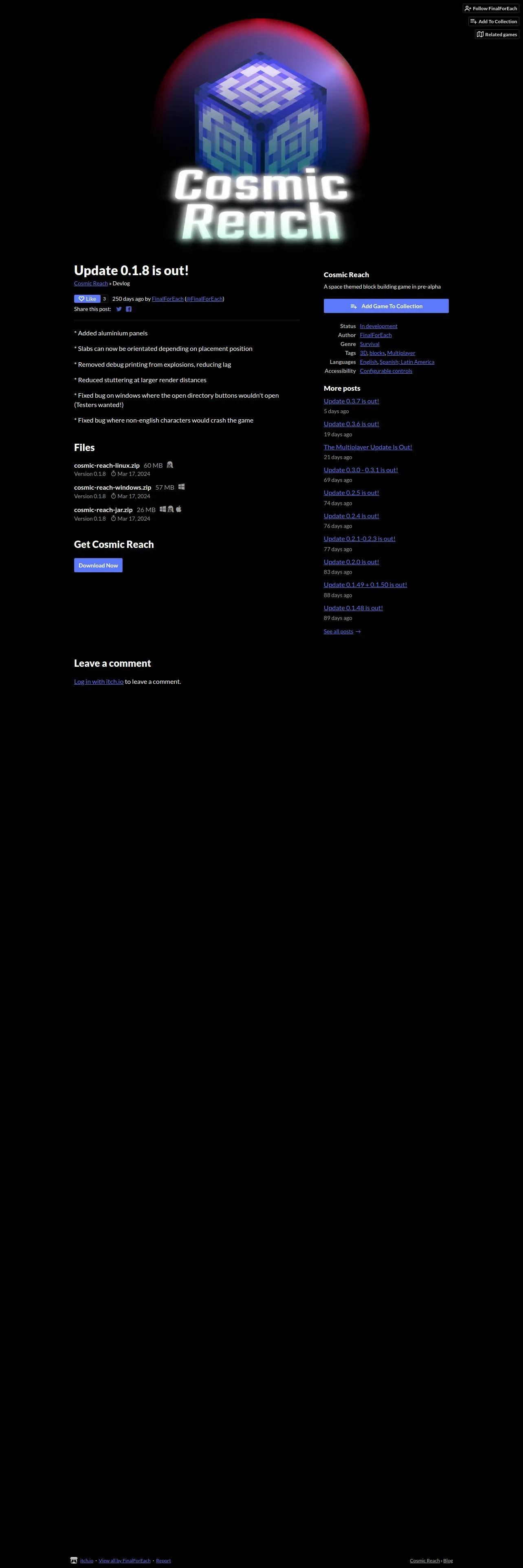 https://finalforeach.itch.io:443/cosmic-reach/devlog/699564/update-018-is-out