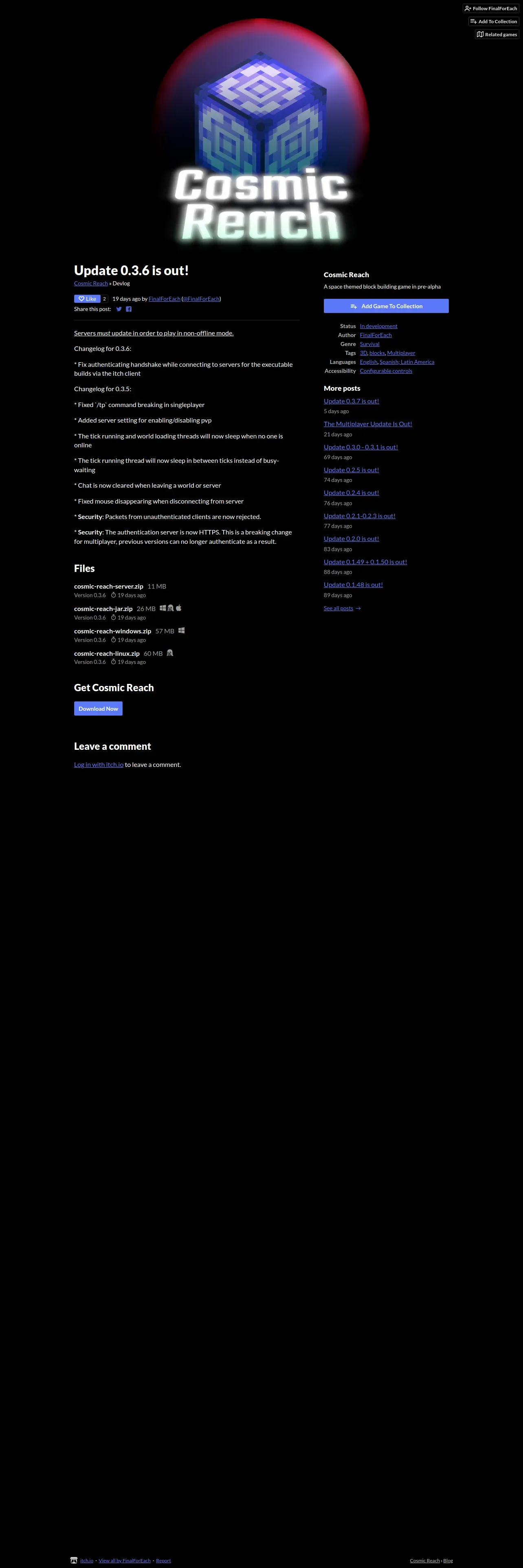 取得元URL: https://finalforeach.itch.io:443/cosmic-reach/devlog/827733/update-036-is-out