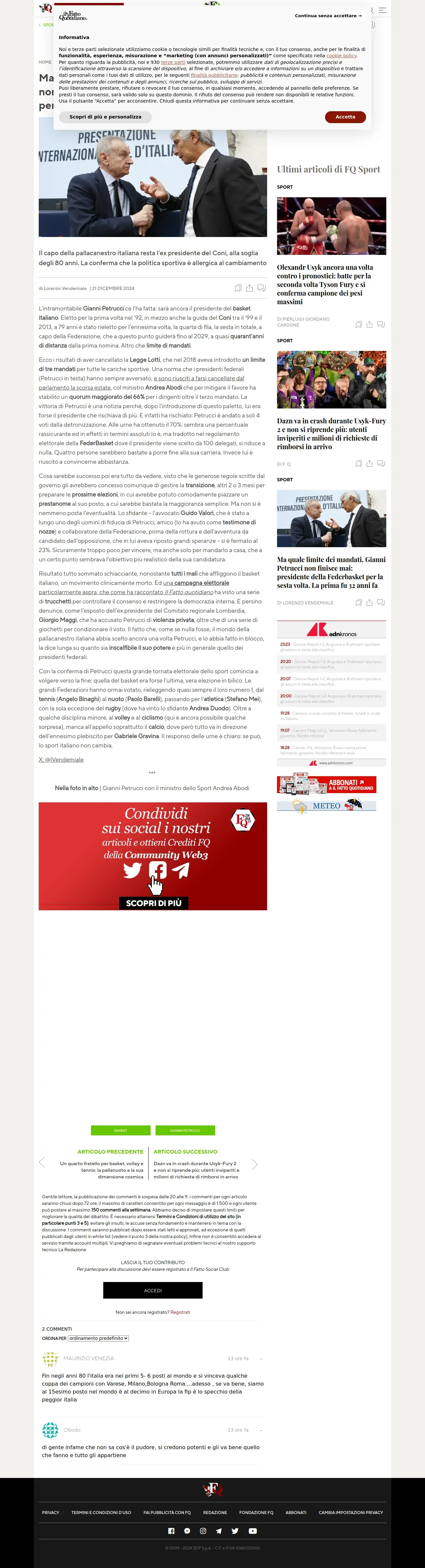 https://www.ilfattoquotidiano.it:443/2024/12/21/gianni-petrucci-basket-federazione-eletto/7813473/