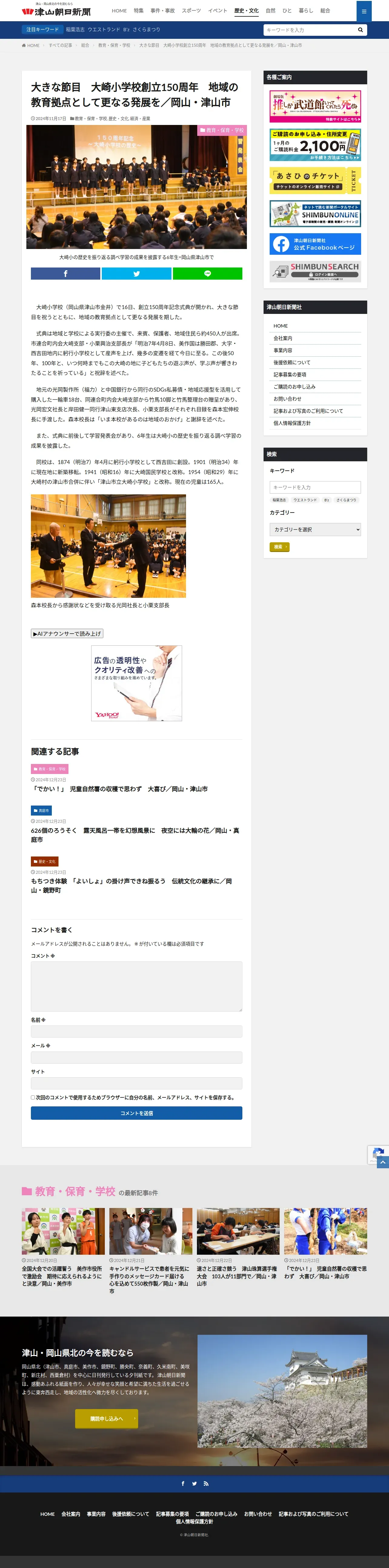 https://tsuyamaasahi.co.jp:443/%e5%a4%a7%e3%81%8d%e3%81%aa%e7%af%80%e7%9b%ae%e3%80%80%e5%a4%a7%e5%b4%8e%e5%b0%8f%e5%ad%a6%e6%a0%a1%e5%89%b5%e7%ab%8b150%e5%91%a8%e5%b9%b4%e3%80%80%e5%9c%b0%e5%9f%9f%e3%81%ae%e6%95%99%e8%82%b2/