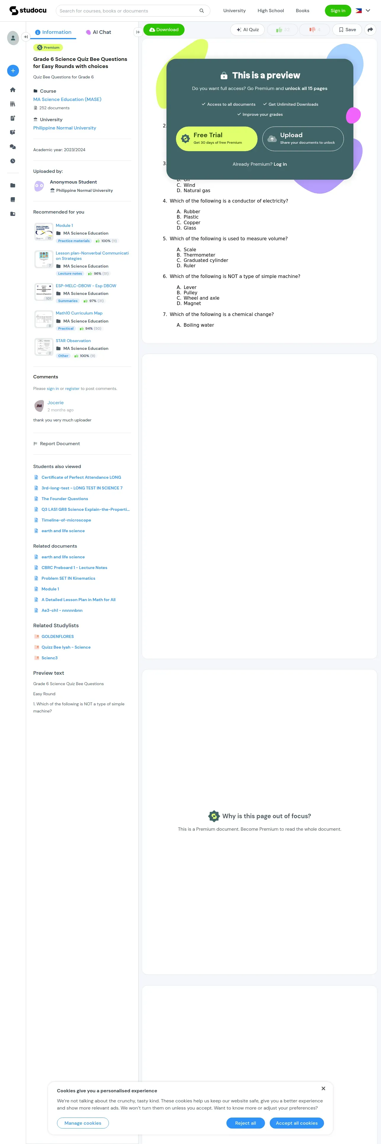 https://www.studocu.com:443/ph/document/philippine-normal-university/ma-science-education/grade-6-science-quiz-bee-questions-for-easy-rounds-with-choices/72802788