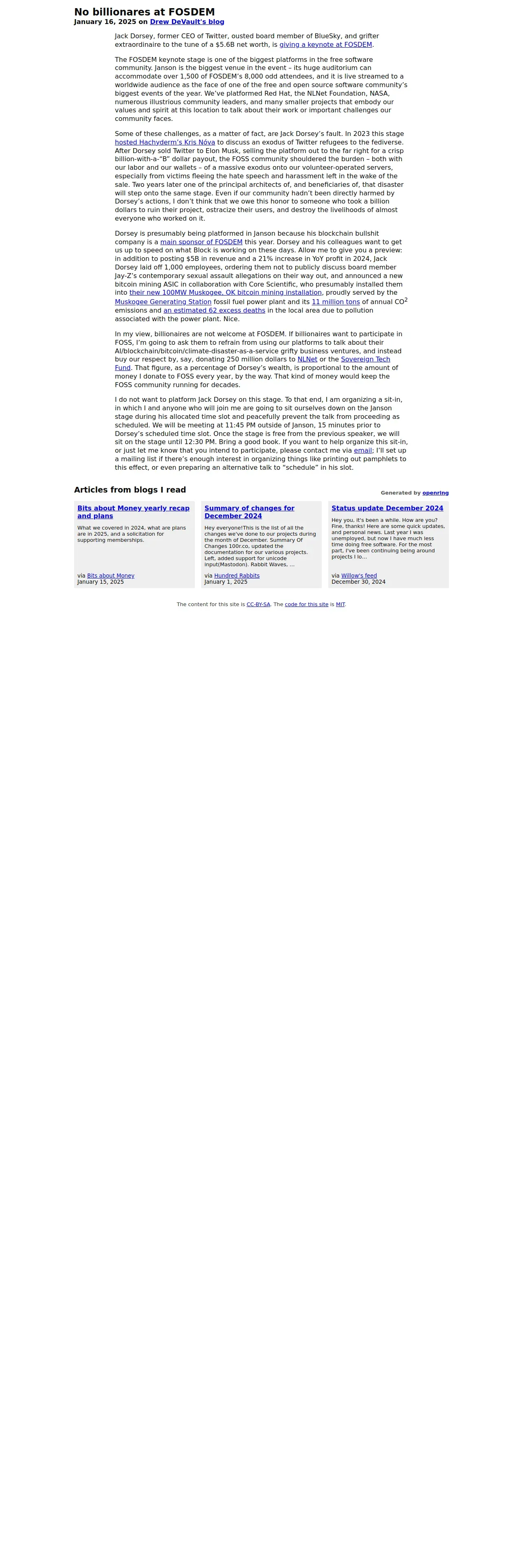 https://drewdevault.com:443/2025/01/16/2025-01-16-No-Billionares-at-FOSDEM-please.html