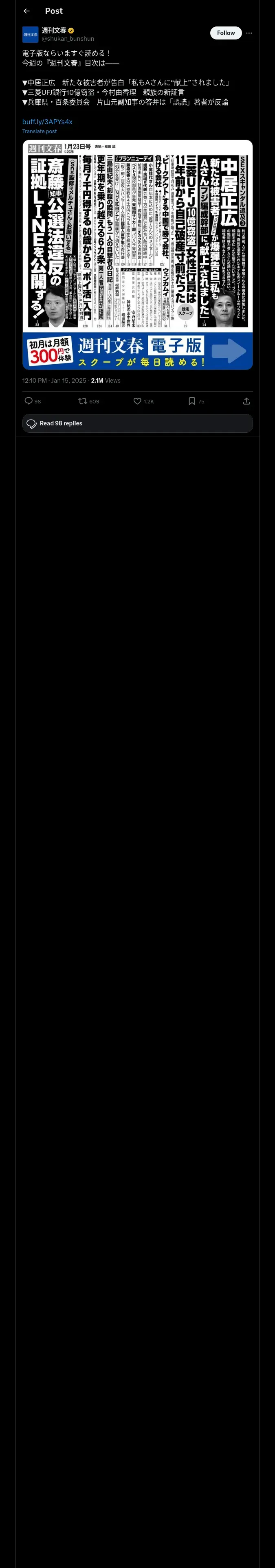 https://x.com:443/shukan_bunshun/status/1879365394139320703