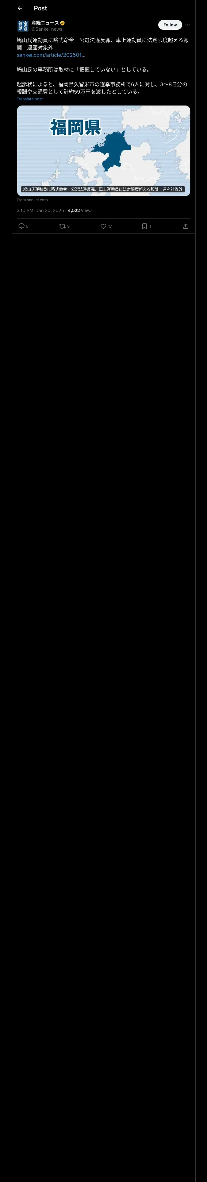 取得元URL: https://x.com:443/sankei_news/status/1881222762213327247