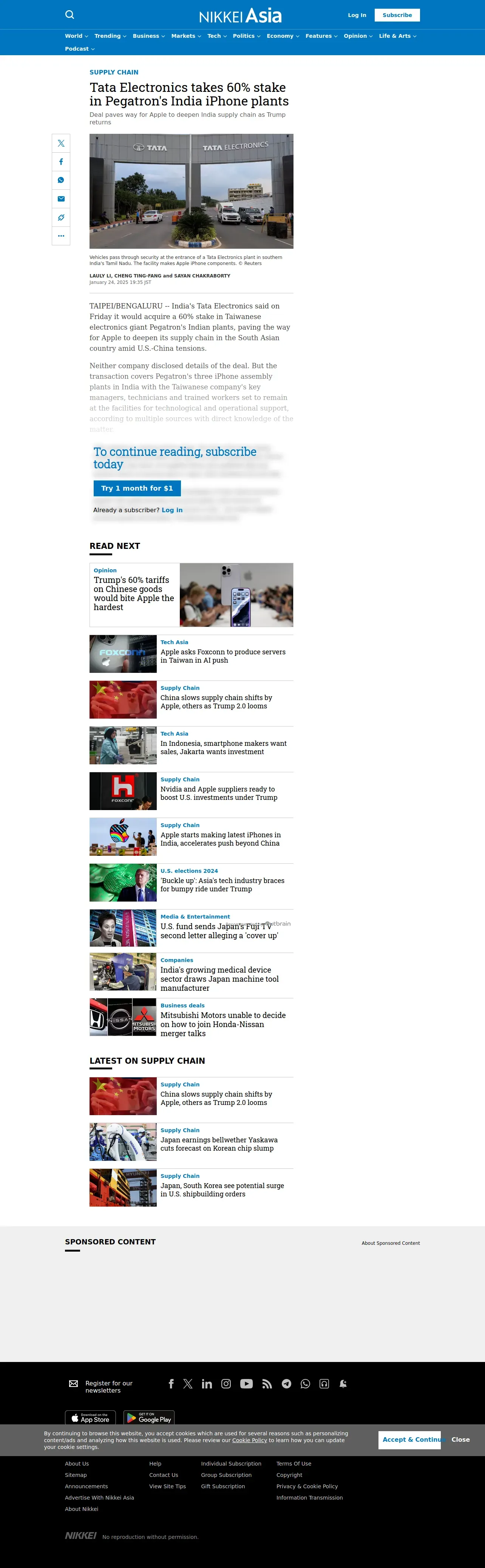 https://asia.nikkei.com:443/Spotlight/Supply-Chain/Tata-Electronics-takes-60-stake-in-Pegatron-s-India-iPhone-plants