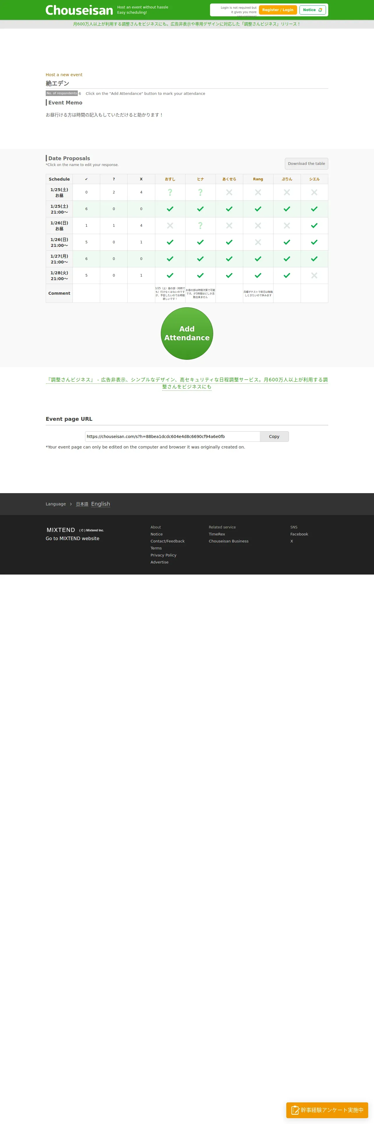 https://chouseisan.com:443/s?h=88bea1dcdc604e4d8c6690cf94a6e0fb