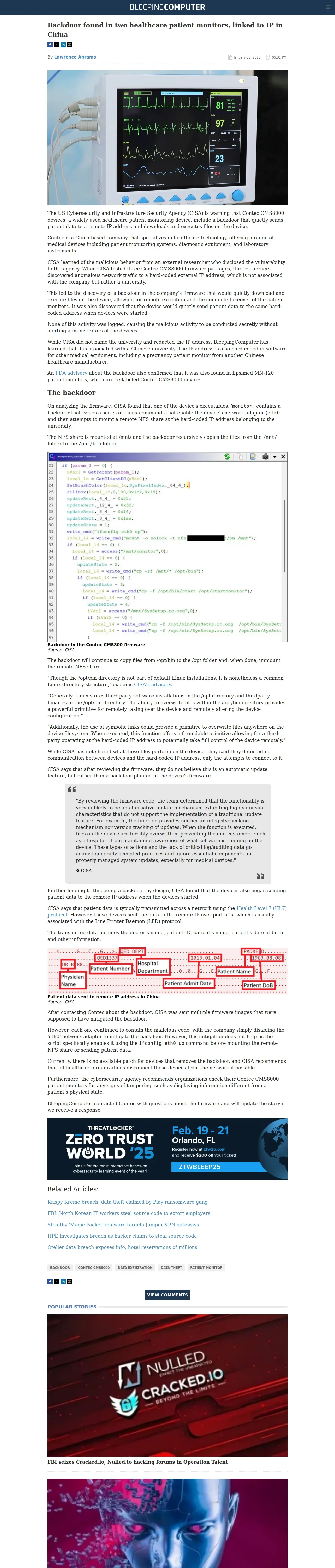 https://www.bleepingcomputer.com:443/news/security/backdoor-found-in-two-healthcare-patient-monitors-linked-to-ip-in-china/amp/