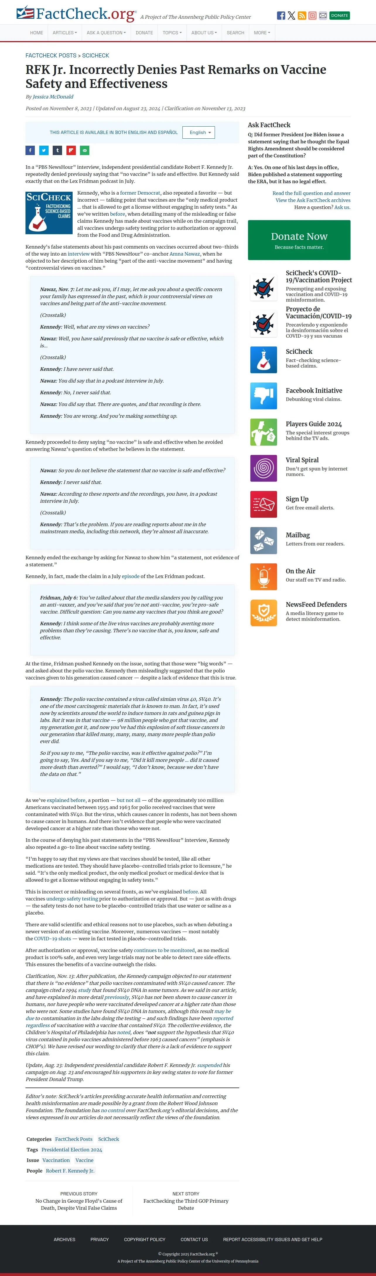 https://www.factcheck.org:443/2023/11/scicheck-rfk-jr-incorrectly-denies-past-remarks-on-vaccine-safety-and-effectiveness/