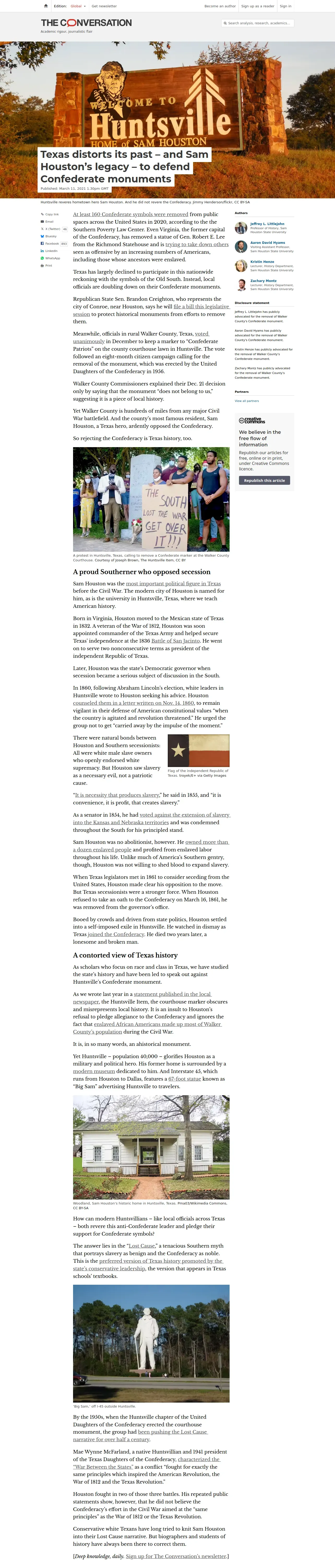 https://theconversation.com:443/texas-distorts-its-past-and-sam-houstons-legacy-to-defend-confederate-monuments-152296