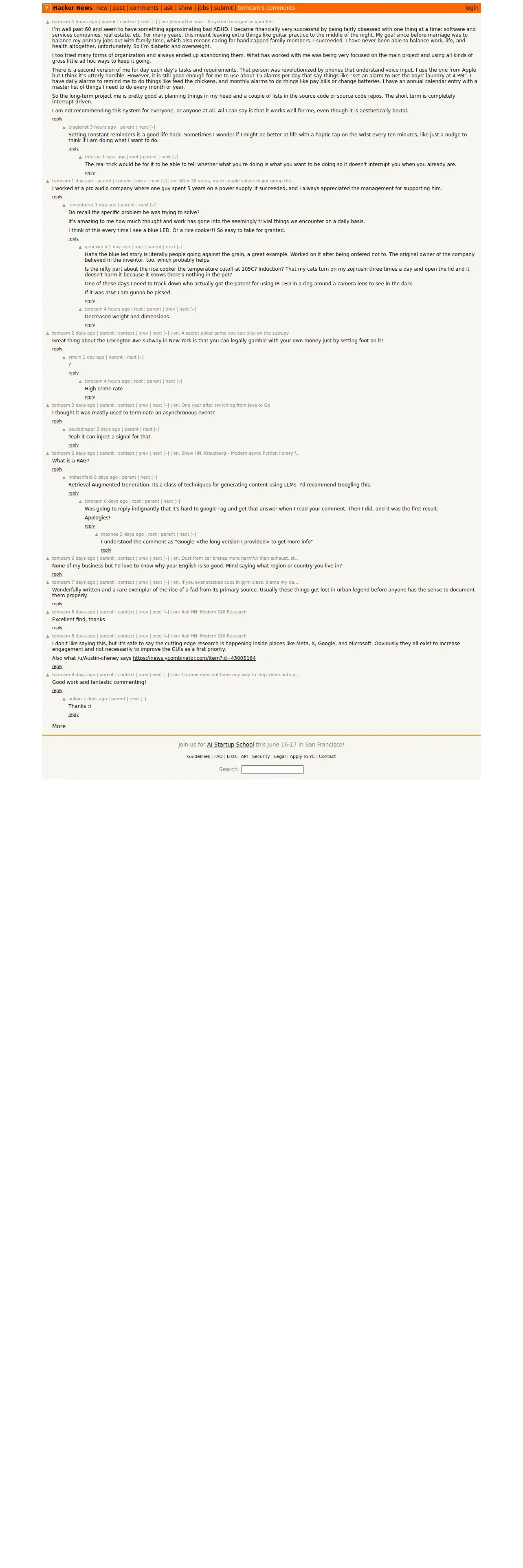 取得元URL: https://news.ycombinator.com:443/threads?id=tomcam