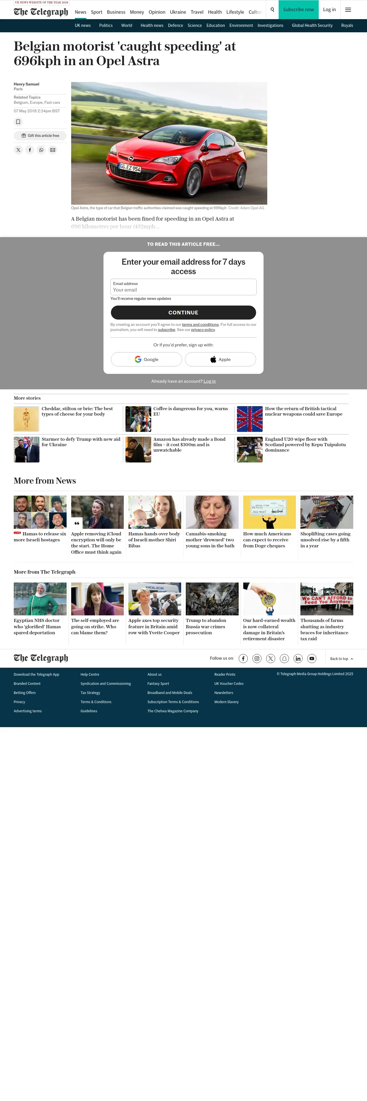 https://www.telegraph.co.uk:443/news/2018/05/07/belgian-motorist-caught-speeding-696kph-opel-astra/
