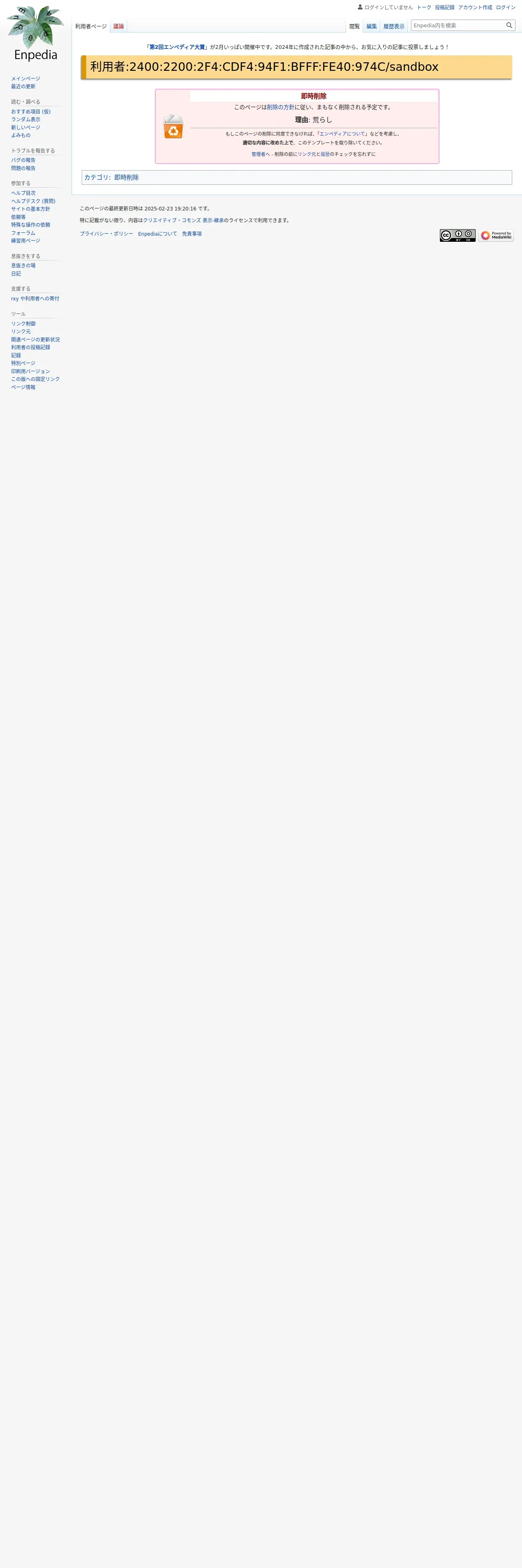 https://enpedia.rxy.jp:443/wiki/%E5%88%A9%E7%94%A8%E8%80%85:2400:2200:2F4:CDF4:94F1:BFFF:FE40:974C/sandbox