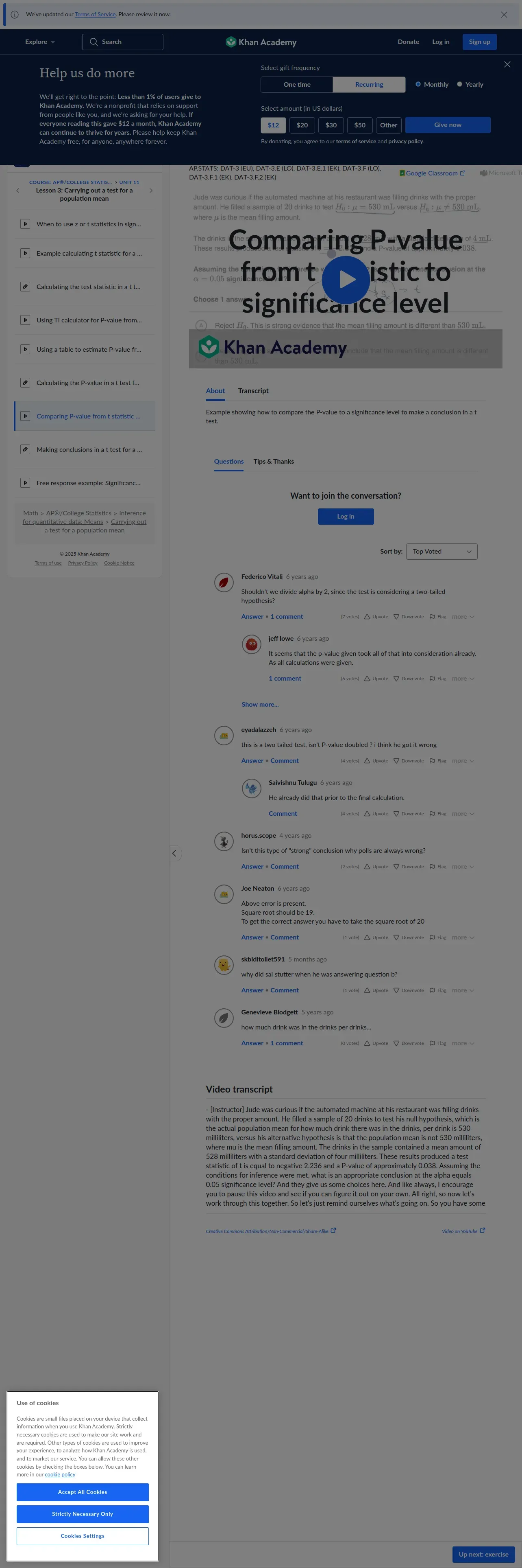 https://www.khanacademy.org:443/math/ap-statistics/xfb5d8e68:inference-quantitative-means/xfb5d8e68:carrying-out-test-mean/v/comparing-p-value-from-t-statistic-to-significance-level