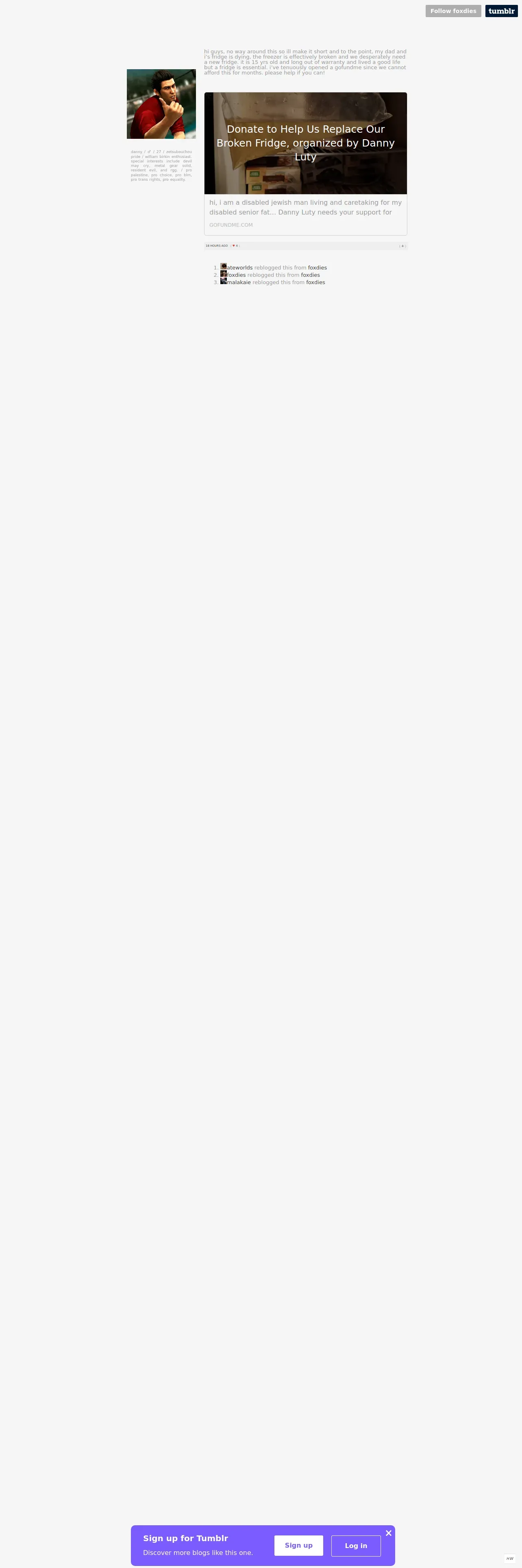 取得元URL: https://foxdies.tumblr.com:443/post/776665887399936000/donate-to-help-us-replace-our-broken-fridge