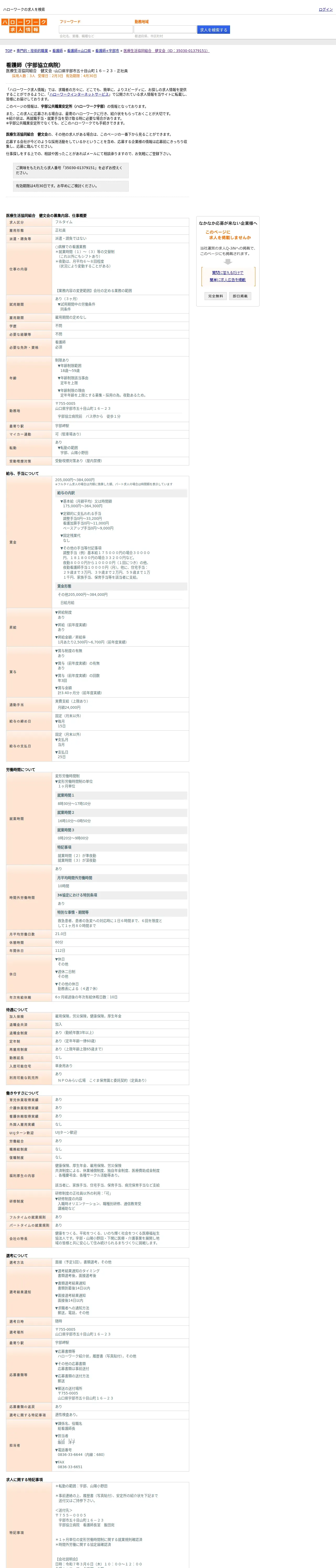 https://www.hellowork.careers:443/%E5%8C%BB%E7%99%82%E7%94%9F%E6%B4%BB%E5%8D%94%E5%90%8C%E7%B5%84%E5%90%88%E3%80%80%E5%81%A5%E6%96%87%E4%BC%9A%E3%81%A7%E3%81%AE%E7%9C%8B%E8%AD%B7%E5%B8%AB%EF%BC%88%E5%AE%87%E9%83%A8%E5%8D%94%E7%AB%8B%E7%97%85%E9%99%A2%EF%BC%89%E3%81%AE%E3%83%8F%E3%83%AD%E3%83%BC%E3%83%AF%E3%83%BC%E3%82%AF%E6%B1%82%E4%BA%BA%E6%83%85%E5%A0%B1%EF%BC%88%E5%B1%B1%E5%8F%A3%E7%9C%8C%E5%AE%87%E9%83%A8%E5%B8%82%EF%BC%89-%2035030-01379151/